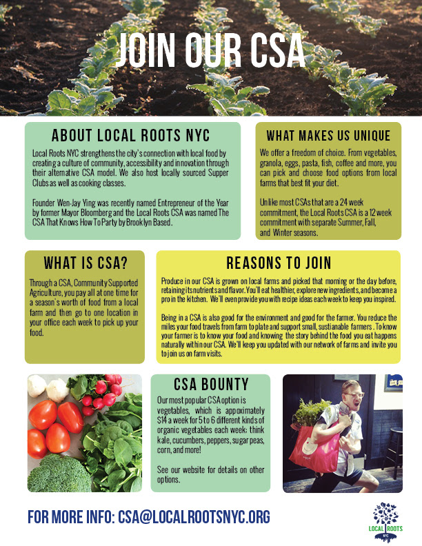 Community Supported Agriculture (CSA) gives you the opportunity to support local farms by pre-purchasing shares. Every week, a delivery location will be setup near Columbia’s campus for easy pick up. The CSA we are working with is Local Roots and you can find out all about the organization and the farms they support at http://localrootsnyc.org/our-csa/.